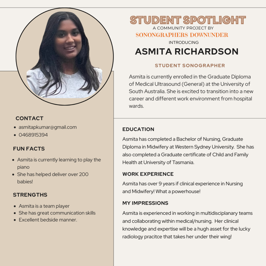 A community project by Sonographers Downunder. We help enrolled students looking for a traineeship by picking one student per month to feature their profile on our LinkedIn Page and Socials. Join Sonographers Downunder Facebook Group and write a post introducing yourself and include the phrase 'I'd love the chance to feature on Student Spotlight'.